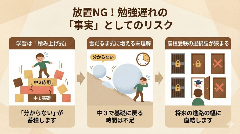 中1・中2の学習内容は積み上げ式のため、一度つまづくと「分からない」が雪だるま式に増え、中3で慌てても基礎に戻る時間が足りないケースが多々あります。